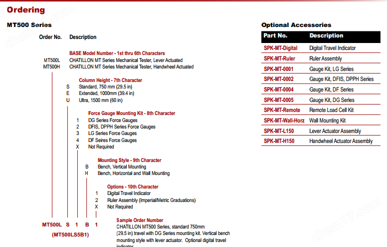 The CHATILLON®MT500 Series mechanical test stand is an easy-to-use solution for force measurement applications up to 500 lbf (2.5kN) capacities. The test stand may be equipped with a quick-action lever or precision handwheel for controlling crosshead speed and travel. The MT500 test stand can be bench mounted, wall mounted or positioned horizontally. Vertical clearances are available from 750mm (29.5 inch) up to 1500mm ( 60 inch). Standard stroke is 6 inches (150mm), although longer strokes can be accommodated as a special order.ChatillonMT500力学测试机