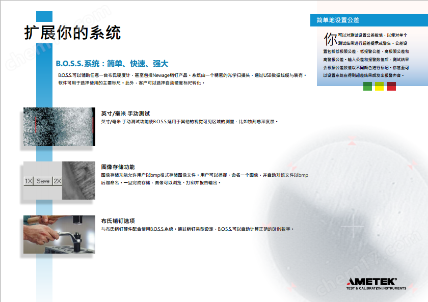 进口B.O.S.S. 光学扫描系统 - 布氏硬度计Newage 的B.O.S.S. 为一款布氏光学扫描系统,其中包含一个高清晰度视频扫描头和成像软件,确保快速、准确、一 致地读取所有布氏压痕。