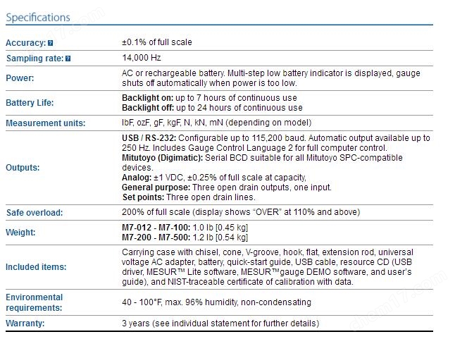 Coefficient of friction and user-defined units are also provided All models include 110V AC adapters. Add suffix ‘E’ for euro plug (220V),‘U’ for UK plug (220V) or ‘A’ for Australian plug (220V). Ex: M7-05E, M7-100U, M7-500A | ||||||||
