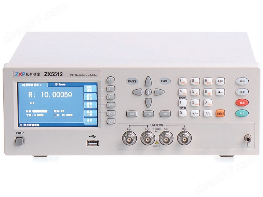 ZX5512系列直流电阻测试仪是采用彩色TFT显示屏幕, 其0.05%的基本精度,可用于线圈、电感、变压器、音圈、 导电膜(布)、发热芯、接触电阻、保险丝、继电器、印制板线电阻、焊孔电阻、接插件电阻、金属探伤等,还可用于自动化设备测试。
