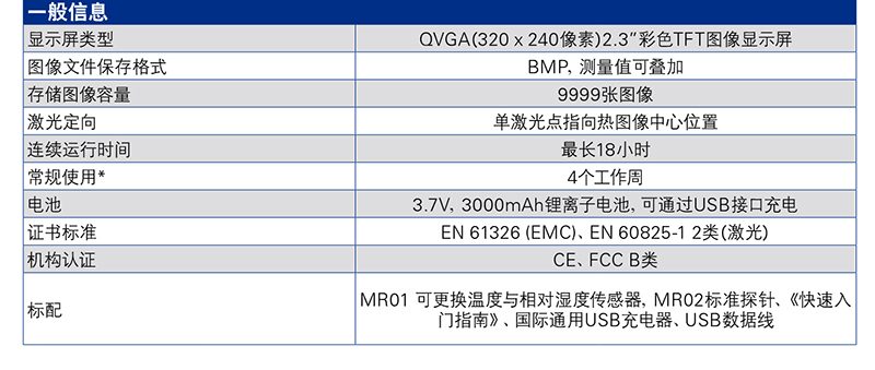 自定义热图像: 选择需集成的测量类型(湿度、 温度、 相对湿度、 露点、 蒸汽压、 混合比); 从4种颜色的调色板(铁红、 彩虹、 冷色与灰白模式)中选择一种; 图像锁定设置可防止检测过程中出现高低温干扰图像的现象